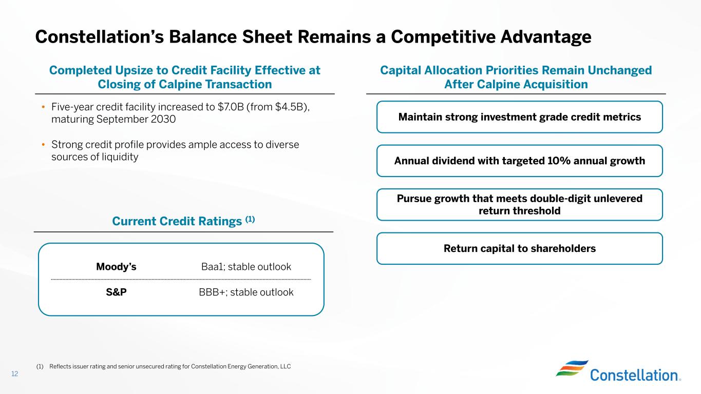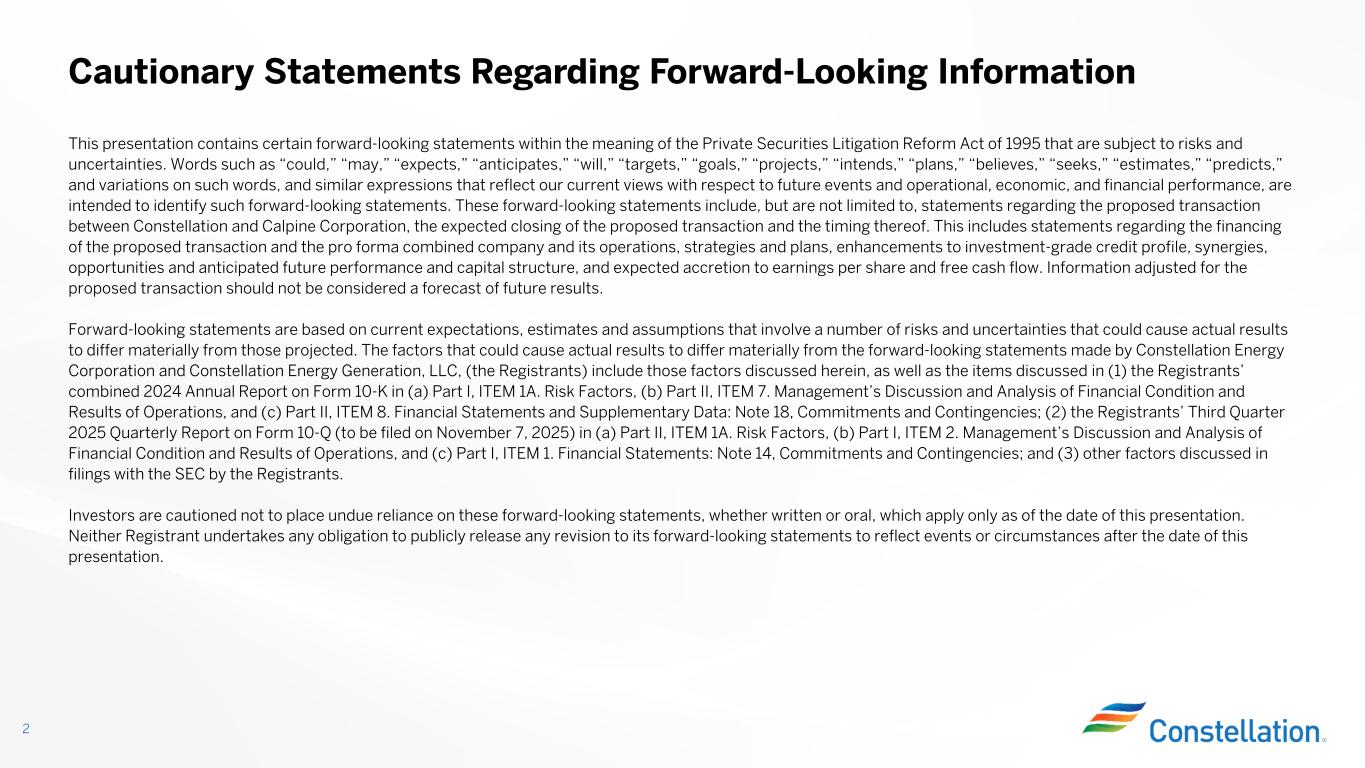 This presentation contains certain forward-looking statements within the meaning of the Private Securities Litigation Reform Act of 1995 that are subject to risks and uncertainties. Words such as “could,” “may,” “expects,” “anticipates,” “will,” “targets,” “goals,” “projects,” “intends,” “plans,” “believes,” “seeks,” “estimates,” “predicts,” and variations on such words, and similar expressions that reflect our current views with respect to future events and operational, economic, and financial performance, are intended to identify such forward-looking statements. These forward-looking statements include, but are not limited to, statements regarding the proposed transaction between Constellation and Calpine Corporation, the expected closing of the proposed transaction and the timing thereof. This includes statements regarding the financing of the proposed transaction and the pro forma combined company and its operations, strategies and plans, enhancements to investment-grade credit profile, synergies, opportunities and anticipated future performance and capital structure, and expected accretion to earnings per share and free cash flow. Information adjusted for the proposed transaction should not be considered a forecast of future results. Forward-looking statements are based on current expectations, estimates and assumptions that involve a number of risks and uncertainties that could cause actual results to differ materially from those projected. The factors that could cause actual results to differ materially from the forward-looking statements made by Constellation Energy Corporation and Constellation Energy Generation, LLC, (the Registrants) include those factors discussed herein, as well as the items discussed in (1) the Registrants’ combined 2024 Annual Report on Form 10-K in (a) Part I, ITEM 1A. Risk Factors, (b) Part II, ITEM 7. Management’s Discussion and Analysis of Financial Condition and Results of Operations, and (c) Part II, ITEM 8. Financial Statements and Supplementary Data: Note 18, Commitments and Contingencies; (2) the Registrants’ Third Quarter 2025 Quarterly Report on Form 10-Q (to be filed on November 7, 2025) in (a) Part II, ITEM 1A. Risk Factors, (b) Part I, ITEM 2. Management’s Discussion and Analysis of Financial Condition and Results of Operations, and (c) Part I, ITEM 1. Financial Statements: Note 14, Commitments and Contingencies; and (3) other factors discussed in filings with the SEC by the Registrants. Investors are cautioned not to place undue reliance on these forward-looking statements, whether written or oral, which apply only as of the date of this presentation. Neither Registrant undertakes any obligation to publicly release any revision to its forward-looking statements to reflect events or circumstances after the date of this presentation. Cautionary Statements Regarding Forward-Looking Information 2