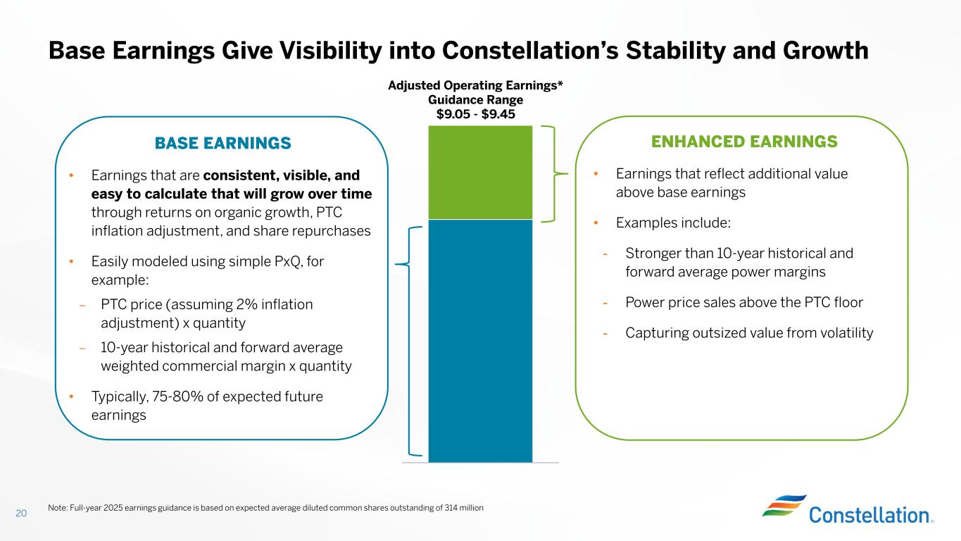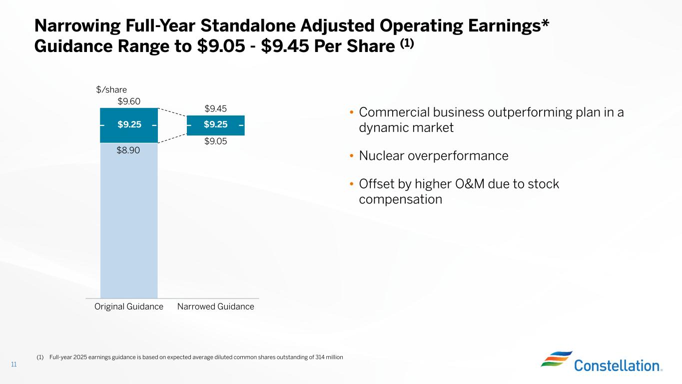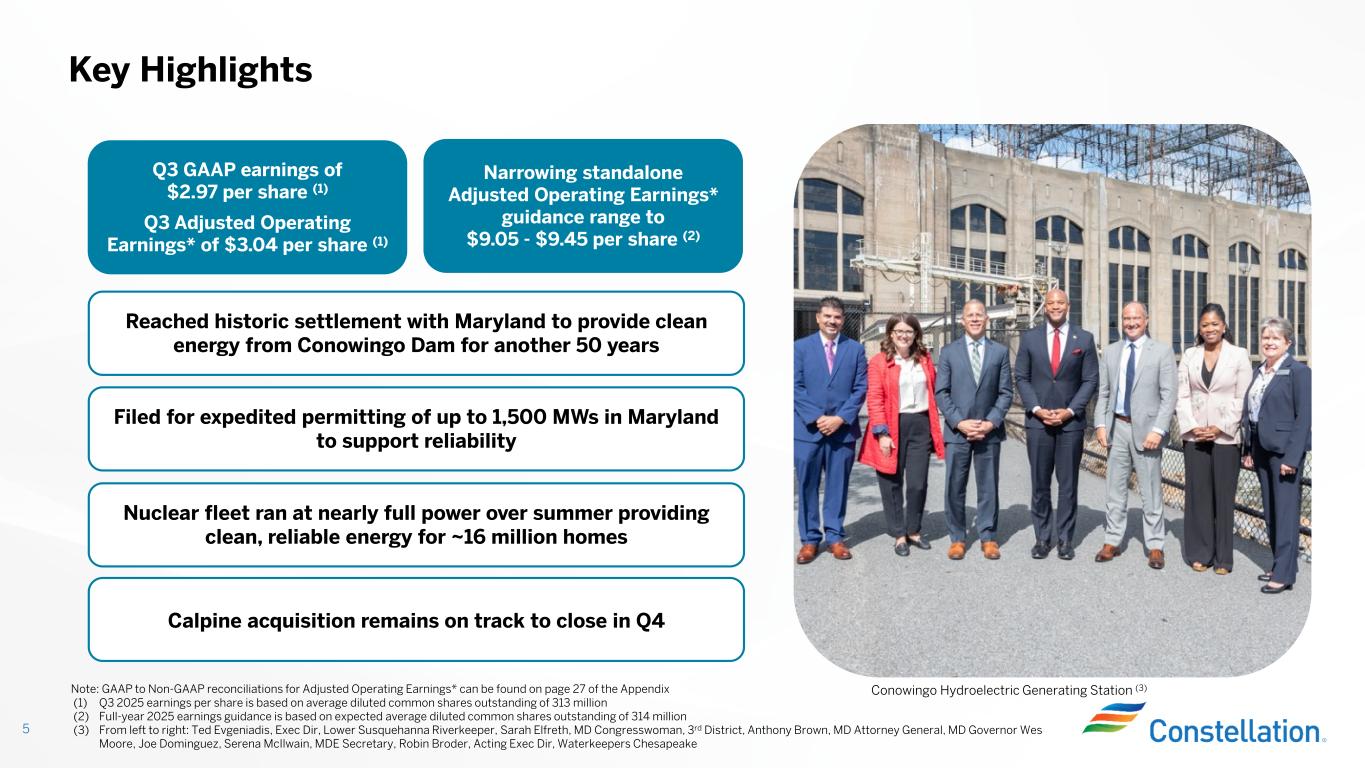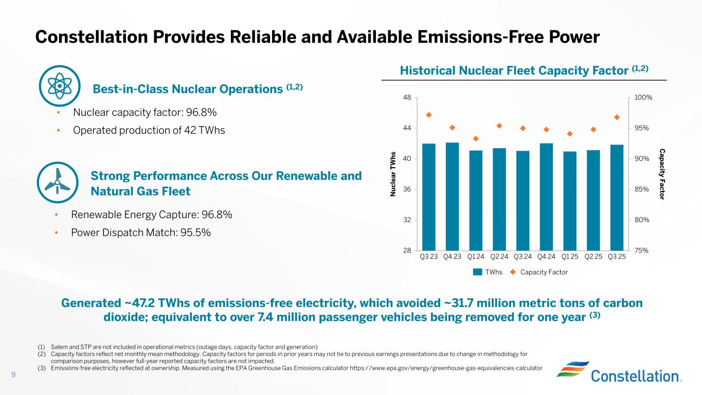 “Constellation delivered adjusted operating earnings of $3.04 per share this quarter, up from $2.74 per share in Q3 of last year,” said Dan Eggers, chief financial officer, Constellation. “We continue to execute well operationally and financially, supported by strong nuclear and commercial performance. We are narrowing our full-year adjusted operating earnings guidance range to $9.05 – $9.45 per share. Nuclear energy is core to the nation’s clean energy and reliability goals, and the strength of our existing fleet – including the potential for life extensions and uprates – positions us to meet growing customer demand. As we approach the close of the Calpine transaction, we are excited to bring these two great companies together and harness the capabilities of the combined company to meet the needs of America with clean, reliable power and innovative products for our customers.”