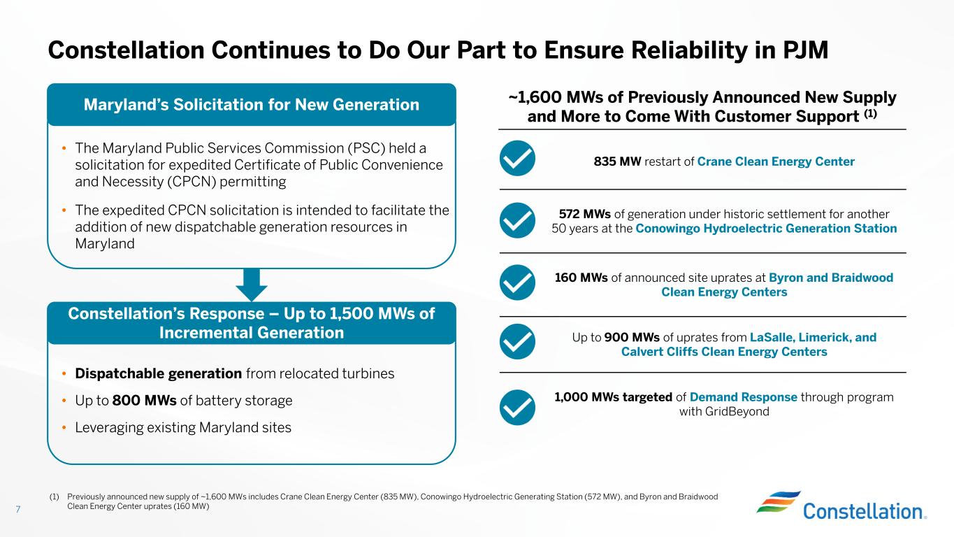 This report contains certain forward-looking statements within the meaning of the Private Securities Litigation Reform Act of 1995 that are subject to risks and uncertainties. Words such as “could,” “may,” “expects,” “anticipates,” “will,” “targets,” “goals,” “projects,” “intends,” “plans,” “believes,” “seeks,” “estimates,” “predicts,” and variations on such words, and similar expressions that reflect our current views with respect to future events and operational, economic, and financial performance, are intended to identify such forward-looking statements. These forward-looking statements include, but are not limited to, statements regarding the proposed transaction between Constellation and Calpine Corporation, the expected closing of the proposed transaction and the timing thereof. This includes statements regarding the financing of the proposed transaction and the pro forma combined company and its operations, strategies and plans, enhancements to investment-grade credit profile, synergies, opportunities and anticipated future performance and capital structure, and expected accretion to earnings per share and free cash flow. Information adjusted for the proposed transaction should not be considered a forecast of future results.