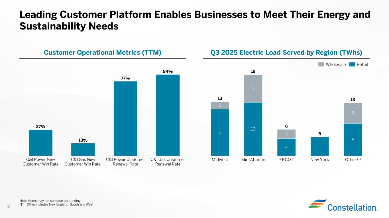 Best-in-Class Nuclear Operations (1,2) • Nuclear capacity factor: 96.8% • Operated production of 42 TWhs 9 Constellation Provides Reliable and Available Emissions-Free Power (1) Salem and STP are not included in operational metrics (outage days, capacity factor and generation) (2) Capacity factors reflect net monthly mean methodology. Capacity factors for periods in prior years may not tie to previous earnings presentations due to change in methodology for comparison purposes, however full-year reported capacity factors are not impacted. (3) Emissions-free electricity reflected at ownership. Measured using the EPA Greenhouse Gas Emissions calculator https://www.epa.gov/energy/greenhouse-gas-equivalencies-calculator 75% 80% 85% 90% 95% 100% 28 32 36 40 44 48 N u cl ea r T W h s C ap acity F acto r Q3 23 Q4 23 Q1 24 Q2 24 Q3 24 Q4 24 Q1 25 Q2 25 Q3 25 TWhs Capacity Factor Generated ~47.2 TWhs of emissions-free electricity, which avoided ~31.7 million metric tons of carbon dioxide; equivalent to over 7.4 million passenger vehicles being removed for one year (3) Historical Nuclear Fleet Capacity Factor (1,2) Strong Performance Across Our Renewable and Natural Gas Fleet • Renewable Energy Capture: 96.8% • Power Dispatch Match: 95.5%