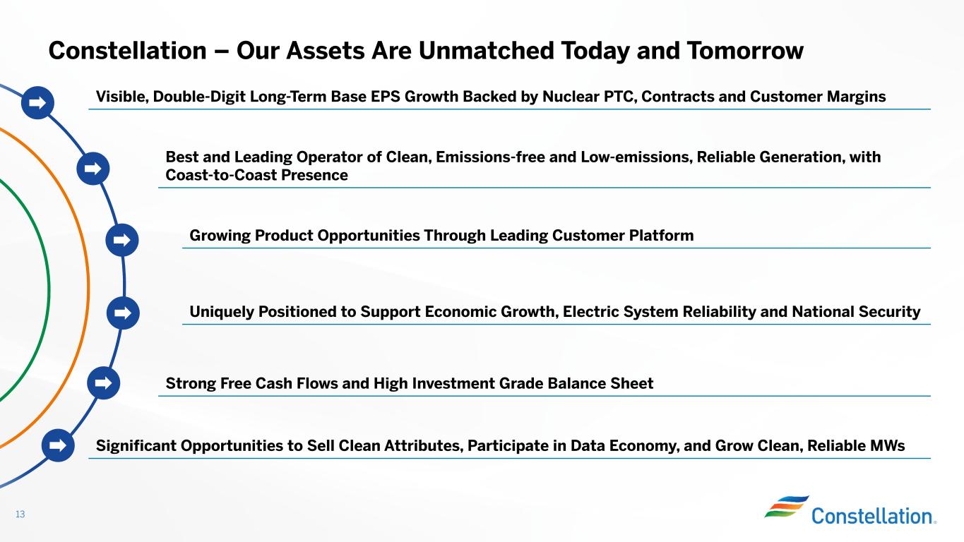 Constellation’s Balance Sheet Remains a Competitive Advantage 12 Baa1; stable outlookMoody’s BBB+; stable outlookS&P Completed Upsize to Credit Facility Effective at Closing of Calpine Transaction Capital Allocation Priorities Remain Unchanged After Calpine Acquisition • Five-year credit facility increased to $7.0B (from $4.5B), maturing September 2030 • Strong credit profile provides ample access to diverse sources of liquidity Current Credit Ratings (1) Maintain strong investment grade credit metrics Annual dividend with targeted 10% annual growth Pursue growth that meets double-digit unlevered return threshold Return capital to shareholders (1) Reflects issuer rating and senior unsecured rating for Constellation Energy Generation, LLC