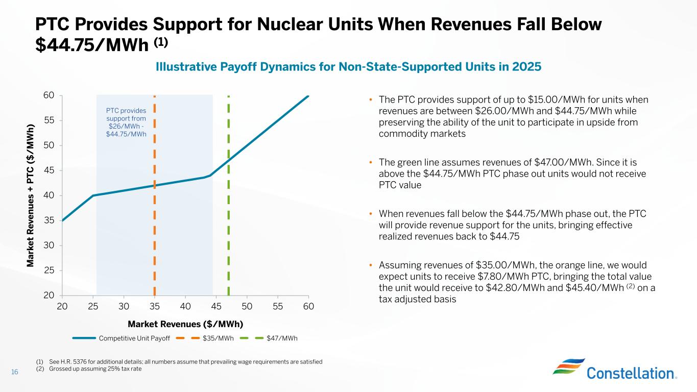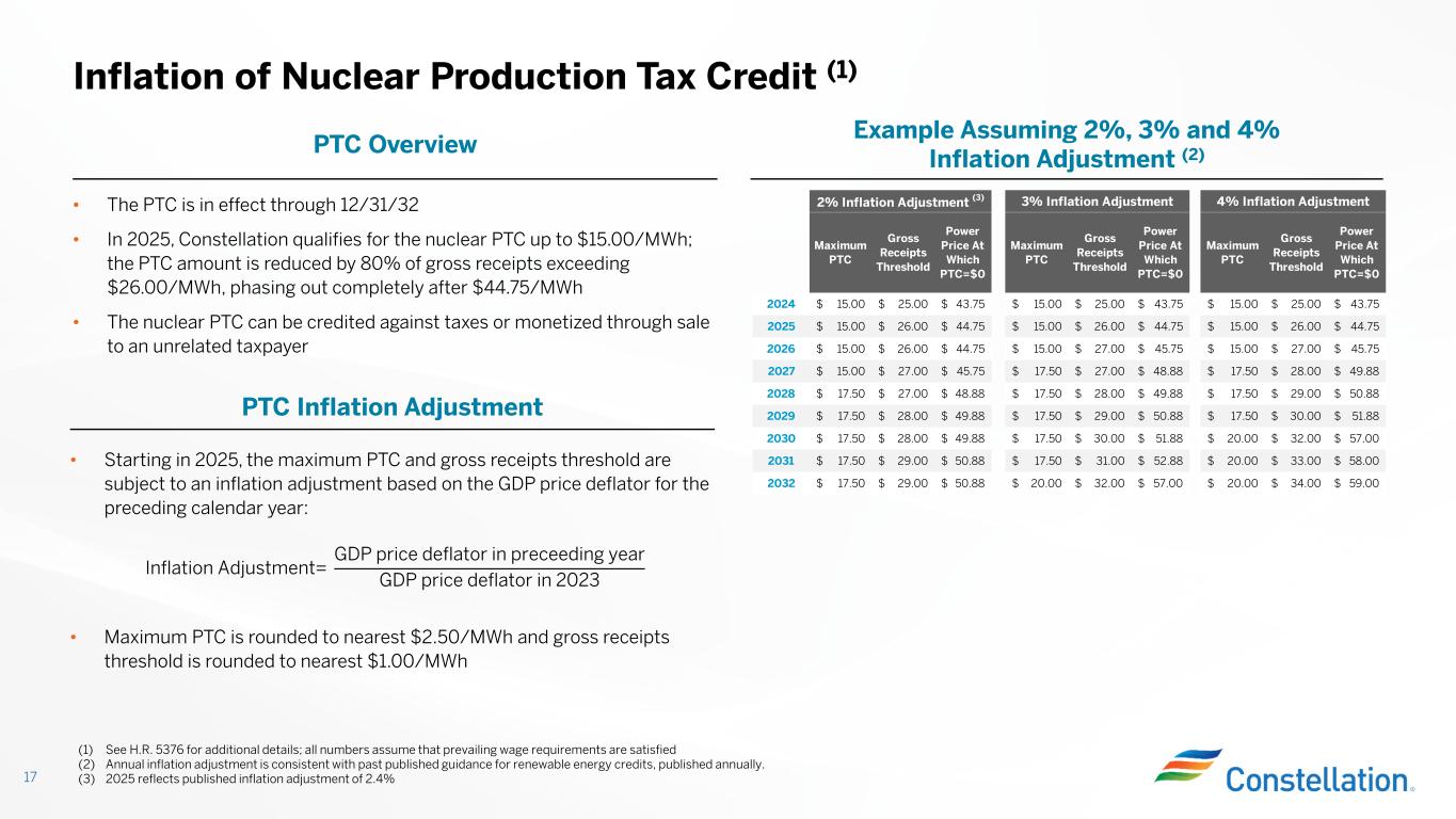 • Starting in 2025, the maximum PTC and gross receipts threshold are subject to an inflation adjustment based on the GDP price deflator for the preceding calendar year: • Maximum PTC is rounded to nearest $2.50/MWh and gross receipts threshold is rounded to nearest $1.00/MWh Inflation of Nuclear Production Tax Credit (1) 17 (1) See H.R. 5376 for additional details; all numbers assume that prevailing wage requirements are satisfied (2) Annual inflation adjustment is consistent with past published guidance for renewable energy credits, published annually. (3) 2025 reflects published inflation adjustment of 2.4% Example Assuming 2%, 3% and 4% Inflation Adjustment (2)PTC Overview Inflation Adjustment= GDP price deflator in preceeding year GDP price deflator in 2023 PTC Inflation Adjustment • The PTC is in effect through 12/31/32 • In 2025, Constellation qualifies for the nuclear PTC up to $15.00/MWh; the PTC amount is reduced by 80% of gross receipts exceeding $26.00/MWh, phasing out completely after $44.75/MWh • The nuclear PTC can be credited against taxes or monetized through sale to an unrelated taxpayer Maximum PTC Gross Receipts Threshold Power Price At Which PTC=$0 Maximum PTC Gross Receipts Threshold Power Price At Which PTC=$0 Maximum PTC Gross Receipts Threshold Power Price At Which PTC=$0 2024 15.00$ 25.00$ 43.75$ 15.00$ 25.00$ 43.75$ 15.00$ 25.00$ 43.75$ 2025 15.00$ 26.00$ 44.75$ 15.00$ 26.00$ 44.75$ 15.00$ 26.00$ 44.75$ 2026 15.00$ 26.00$ 44.75$ 15.00$ 27.00$ 45.75$ 15.00$ 27.00$ 45.75$ 2027 15.00$ 27.00$ 45.75$ 17.50$ 27.00$ 48.88$ 17.50$ 28.00$ 49.88$ 2028 17.50$ 27.00$ 48.88$ 17.50$ 28.00$ 49.88$ 17.50$ 29.00$ 50.88$ 2029 17.50$ 28.00$ 49.88$ 17.50$ 29.00$ 50.88$ 17.50$ 30.00$ 51.88$ 2030 17.50$ 28.00$ 49.88$ 17.50$ 30.00$ 51.88$ 20.00$ 32.00$ 57.00$ 2031 17.50$ 29.00$ 50.88$ 17.50$ 31.00$ 52.88$ 20.00$ 33.00$ 58.00$ 2032 17.50$ 29.00$ 50.88$ 20.00$ 32.00$ 57.00$ 20.00$ 34.00$ 59.00$ 2% Inflation Adjustment (3) 3% Inflation Adjustment 4% Inflation Adjustment