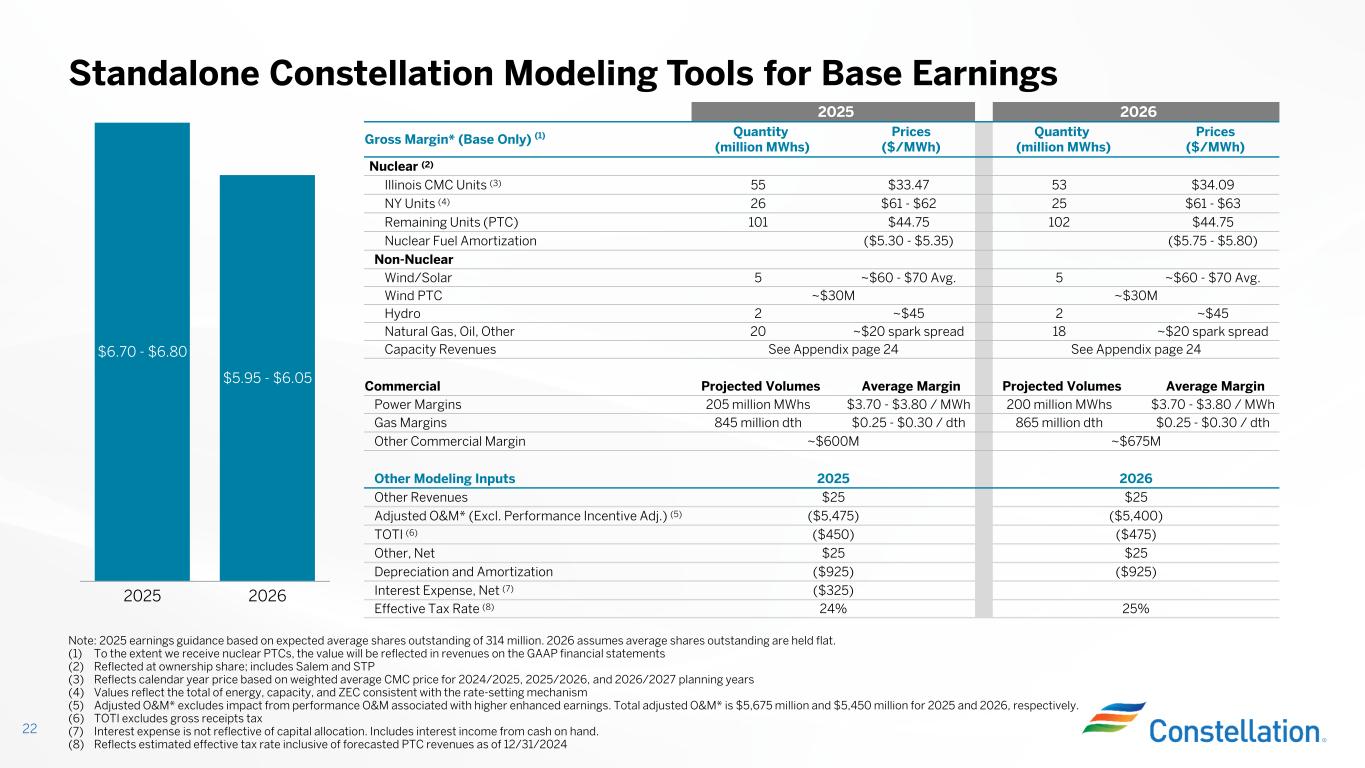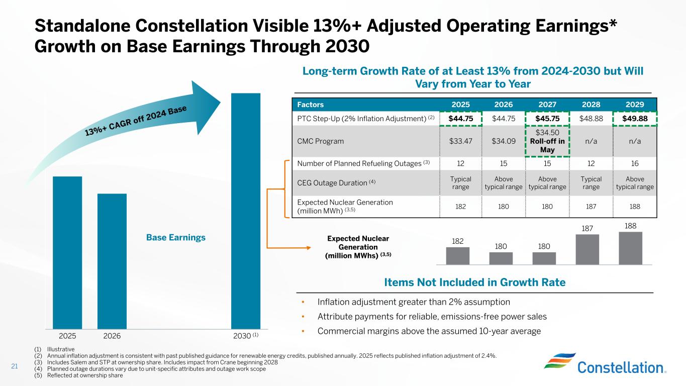 2025 2026 2030 (1) 20292028202720262025Factors $49.88$48.88$45.75$44.75$44.75PTC Step-Up (2% Inflation Adjustment) (2) n/an/a $34.50 Roll-off in May $34.09$33.47CMC Program 1612151512Number of Planned Refueling Outages (3) Above typical range Typical range Above typical range Above typical range Typical rangeCEG Outage Duration (4) 188187180180182 Expected Nuclear Generation (million MWh) (3,5) 21 Standalone Constellation Visible 13%+ Adjusted Operating Earnings* Growth on Base Earnings Through 2030 Long-term Growth Rate of at Least 13% from 2024-2030 but Will Vary from Year to Year • Inflation adjustment greater than 2% assumption • Attribute payments for reliable, emissions-free power sales • Commercial margins above the assumed 10-year average Items Not Included in Growth Rate Base Earnings 182 180 180 187 188 Expected Nuclear Generation (million MWhs) (3,5) (1) Illustrative (2) Annual inflation adjustment is consistent with past published guidance for renewable energy credits, published annually. 2025 reflects published inflation adjustment of 2.4%. (3) Includes Salem and STP at ownership share. Includes impact from Crane beginning 2028 (4) Planned outage durations vary due to unit-specific attributes and outage work scope (5) Reflected at ownership share