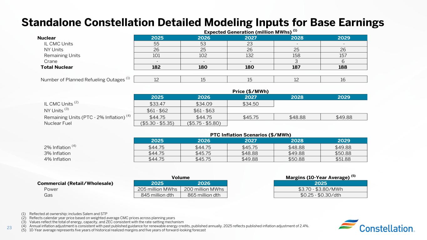Standalone Constellation Detailed Modeling Inputs for Base Earnings 23 (1) Reflected at ownership; includes Salem and STP (2) Reflects calendar year price based on weighted average CMC prices across planning years (3) Values reflect the total of energy, capacity, and ZEC consistent with the rate-setting mechanism (4) Annual inflation adjustment is consistent with past published guidance for renewable energy credits, published annually. 2025 reflects published inflation adjustment of 2.4%. (5) 10-Year average represents five years of historical realized margins and five years of forward-looking forecast Expected Generation (million MWhs) (1) Nuclear 2025 2026 2027 2028 2029 IL CMC Units 55 53 23 - - NY Units 26 25 26 25 26 Remaining Units 101 102 132 158 157 Crane - - - 3 6 Total Nuclear 182 180 180 187 188 Number of Planned Refueling Outages (1) 12 15 15 12 16 Price ($/MWh) 2025 2026 2027 2028 2029 IL CMC Units (2) $33.47 $34.09 $34.50 NY Units (3) $61 - $62 $61 - $63 Remaining Units (PTC - 2% Inflation) (4) $44.75 $44.75 $45.75 $48.88 $49.88 Nuclear Fuel ($5.30 - $5.35) ($5.75 - $5.80) PTC Inflation Scenarios ($/MWh) 2025 2026 2027 2028 2029 2% Inflation (4) $44.75 $44.75 $45.75 $48.88 $49.88 3% Inflation $44.75 $45.75 $48.88 $49.88 $50.88 4% Inflation $44.75 $45.75 $49.88 $50.88 $51.88 Volume Margins (10-Year Average) (5) Commercial (Retail/Wholesale) 2025 2026 2025 Power 205 million MWhs 200 million MWhs $3.70 - $3.80/MWh Gas 845 million dth 865 million dth $0.25 - $0.30/dth