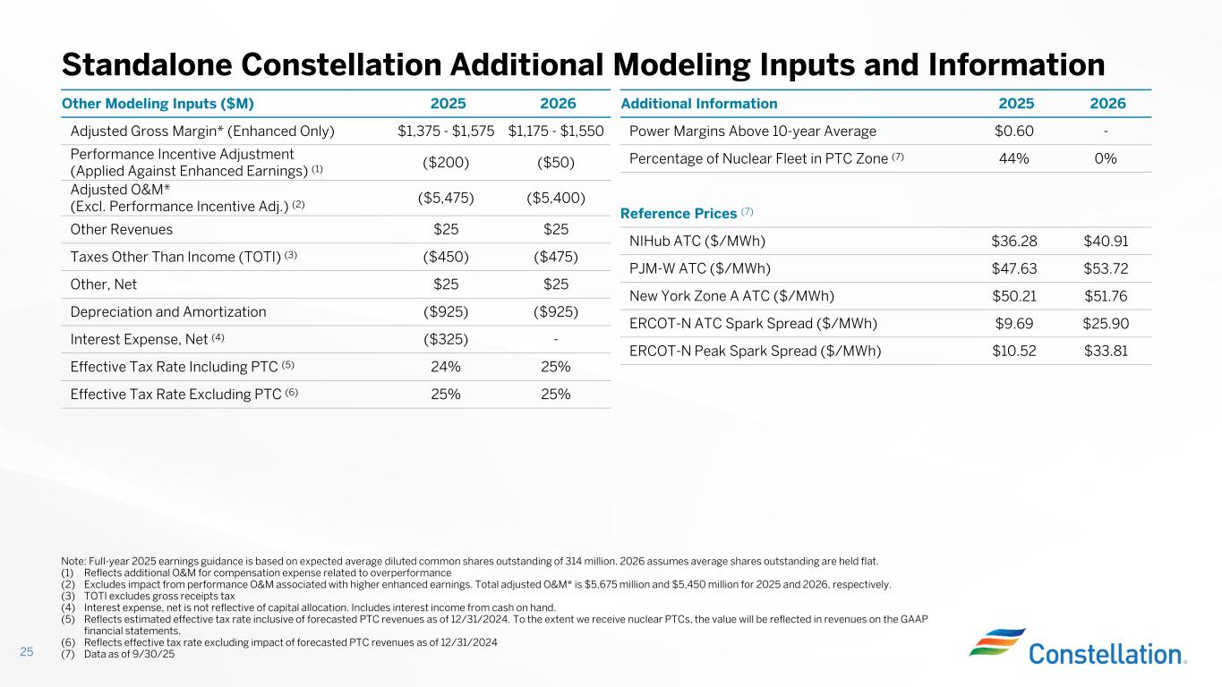 Standalone Constellation Detailed Modeling Inputs for Base Earnings (continued) 24 (1) Hydro revenue price and representative spark spread reflect consistent historical average we have achieved across hydro and fossil assets, respectively (2) Volumes are rounded and reflect Constellation’s ownership share of partially owned units (3) ISO-NE: ISO New England; NEMA: Northeastern Massachusetts and Boston; SEMA: Southeastern Massachusetts (4) Represents offered capacity at ownership Expected Generation (million MWhs) Non-Nuclear (Energy) 2025 2026 Wind/Solar 5 5 Historical renewable contracts $60 - $70 Hydro 2 2 Hydro revenue price ($/MWh) $45 Natural Gas, Oil, Other 20 18 Representative spark spread ($/MWh) $20 2024/2025 2025/2026 Non-Nuclear (Capacity) Cleared Volumes (MW) (2) Cleared Prices ($/MW-day) Cleared Volumes (MW) (2) Cleared Price ($/MW-day) EMAAC 1,950 $55 1,525 $270 MAAC 200 $49 100 $270 BGE 425 $73 325 $466 Total PJM Portfolio 2,575 1,950 2024/2025 2025/2026 Capacity (4) Price ($/MW-day) Capacity (4) Price ($/MW-day) NEMA 115 $131 125 $87 SEMA 235 $632 235 $87 Total ISO-NE (3) 350 360 Modeling Prices ($/MWh) (1) Note: Base earnings assumes clearing price of $150/MW-d. Capacity revenues for nuclear units are included in the gross receipts calculation for the PTC and therefore not provided