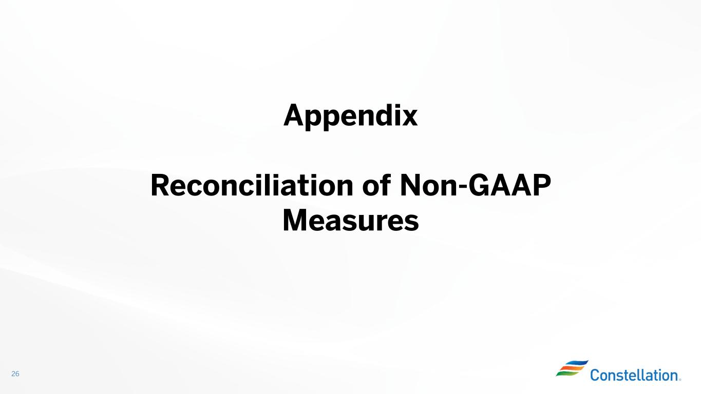 Standalone Constellation Additional Modeling Inputs and Information 25 Note: Full-year 2025 earnings guidance is based on expected average diluted common shares outstanding of 314 million. 2026 assumes average shares outstanding are held flat. (1) Reflects additional O&M for compensation expense related to overperformance (2) Excludes impact from performance O&M associated with higher enhanced earnings. Total adjusted O&M* is $5,675 million and $5,450 million for 2025 and 2026, respectively. (3) TOTI excludes gross receipts tax (4) Interest expense, net is not reflective of capital allocation. Includes interest income from cash on hand. (5) Reflects estimated effective tax rate inclusive of forecasted PTC revenues as of 12/31/2024. To the extent we receive nuclear PTCs, the value will be reflected in revenues on the GAAP financial statements. (6) Reflects effective tax rate excluding impact of forecasted PTC revenues as of 12/31/2024 (7) Data as of 9/30/25 20262025Other Modeling Inputs ($M) $1,175 - $1,550$1,375 - $1,575Adjusted Gross Margin* (Enhanced Only) ($50)($200) Performance Incentive Adjustment (Applied Against Enhanced Earnings) (1) ($5,400)($5,475) Adjusted O&M* (Excl. Performance Incentive Adj.) (2) $25$25Other Revenues ($475)($450)Taxes Other Than Income (TOTI) (3) $25$25Other, Net ($925)($925)Depreciation and Amortization -($325)Interest Expense, Net (4) 25%24%Effective Tax Rate Including PTC (5) 25%25%Effective Tax Rate Excluding PTC (6) 20262025Additional Information -$0.60Power Margins Above 10-year Average 0%44%Percentage of Nuclear Fleet in PTC Zone (7) Reference Prices (7) $40.91$36.28 NIHub ATC ($/MWh) $53.72$47.63 PJM-W ATC ($/MWh) $51.76 $50.21 New York Zone A ATC ($/MWh) $25.90 $9.69 ERCOT-N ATC Spark Spread ($/MWh) $33.81$10.52ERCOT-N Peak Spark Spread ($/MWh)