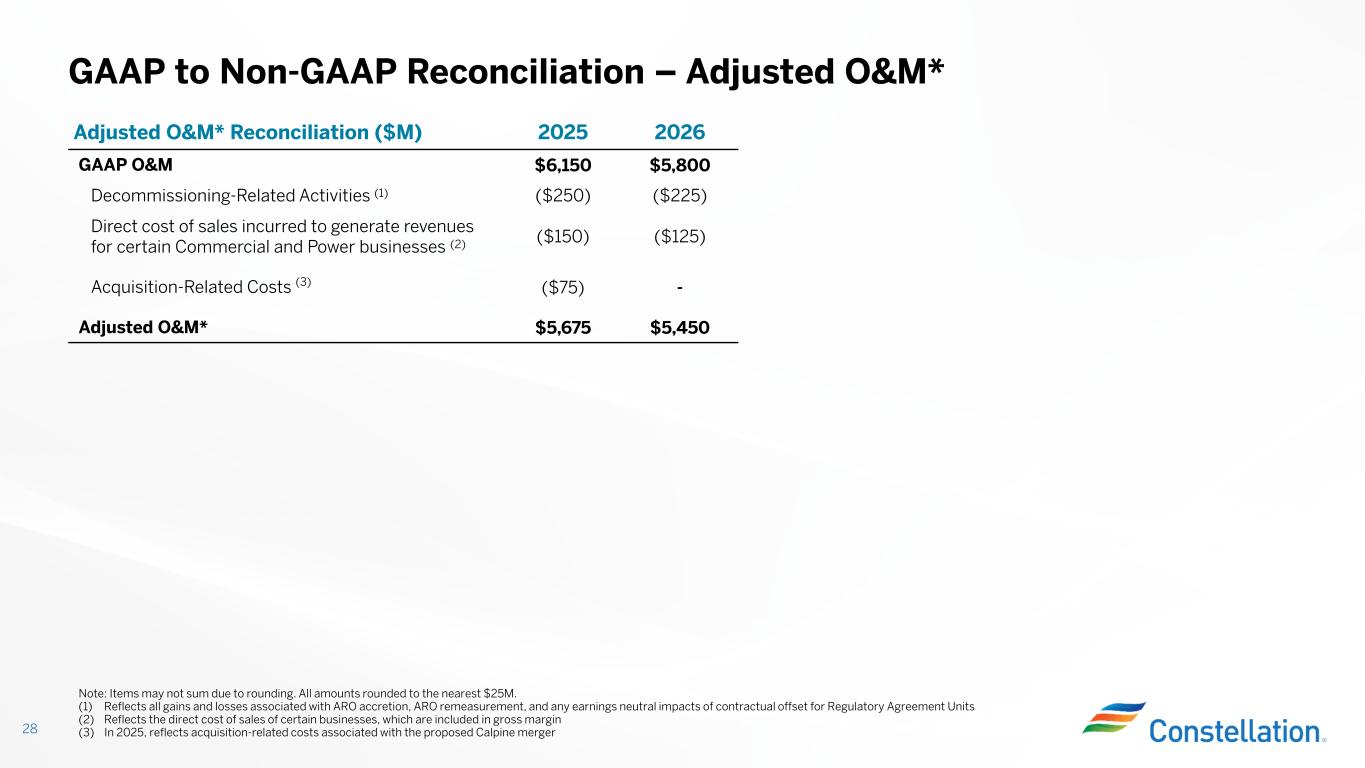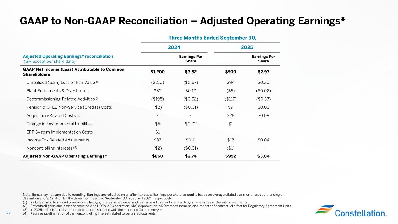 Three Months Ended September 30, 20252024 Earnings Per Share Earnings Per Share Adjusted Operating Earnings* reconciliation ($M except per share data) $2.97$930$3.82$1,200 GAAP Net Income (Loss) Attributable to Common Shareholders $0.30$94($0.67)($210)Unrealized (Gain) Loss on Fair Value (1) ($0.02)($5)$0.10$30Plant Retirements & Divestitures ($0.37)($117)($0.62)($195)Decommissioning-Related Activities (2) $0.03$9($0.01)($2)Pension & OPEB Non-Service (Credits) Costs $0.09$28--Acquisition-Related Costs (3) -$1$0.02$5Change in Environmental Liabilities ---$1ERP System Implementation Costs $0.04$13$0.11$33Income Tax Related Adjustments -($1)($0.01)($2)Noncontrolling Interests (4) $3.04$952$2.74$860Adjusted Non-GAAP Operating Earnings* GAAP to Non-GAAP Reconciliation – Adjusted Operating Earnings* 27 Note: Items may not sum due to rounding. Earnings are reflected on an after-tax basis. Earnings per share amount is based on average diluted common shares outstanding of 313 million and 314 million for the three months ended September 30, 2025 and 2024, respectively. (1) Includes mark-to-market on economic hedges, interest rate swaps, and fair value adjustments related to gas imbalances and equity investments (2) Reflects all gains and losses associated with NDTs, ARO accretion, ARC depreciation, ARO remeasurement, and impacts of contractual offset for Regulatory Agreement Units (3) In 2025, reflects acquisition-related costs associated with the proposed Calpine merger (4) Represents elimination of the noncontrolling interest related to certain adjustments
