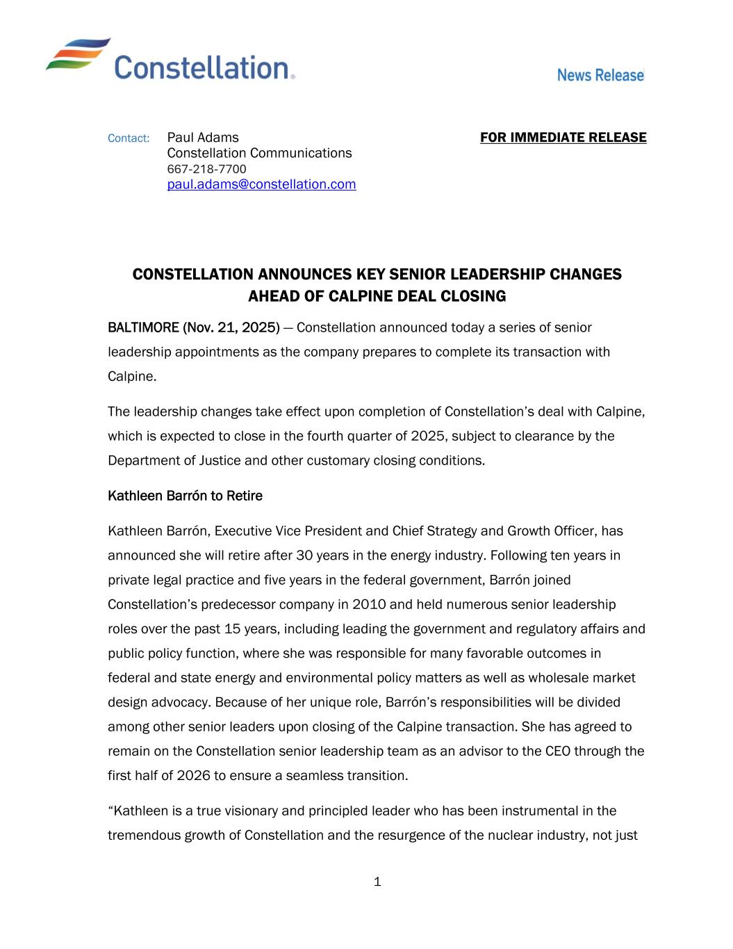 1 Contact: Paul Adams Constellation Communications 667-218-7700 paul.adams@constellation.com FOR IMMEDIATE RELEASE CONSTELLATION ANNOUNCES KEY SENIOR LEADERSHIP CHANGES AHEAD OF CALPINE DEAL CLOSING BALTIMORE (Nov. 21, 2025) — Constellation announced today a series of senior leadership appointments as the company prepares to complete its transaction with Calpine. The leadership changes take effect upon completion of Constellation’s deal with Calpine, which is expected to close in the fourth quarter of 2025, subject to clearance by the Department of Justice and other customary closing conditions. Kathleen Barrón to Retire Kathleen Barrón, Executive Vice President and Chief Strategy and Growth Officer, has announced she will retire after 30 years in the energy industry. Following ten years in private legal practice and five years in the federal government, Barrón joined Constellation’s predecessor company in 2010 and held numerous senior leadership roles over the past 15 years, including leading the government and regulatory affairs and public policy function, where she was responsible for many favorable outcomes in federal and state energy and environmental policy matters as well as wholesale market design advocacy. Because of her unique role, Barrón’s responsibilities will be divided among other senior leaders upon closing of the Calpine transaction. She has agreed to remain on the Constellation senior leadership team as an advisor to the CEO through the first half of 2026 to ensure a seamless transition. “Kathleen is a true visionary and principled leader who has been instrumental in the tremendous growth of Constellation and the resurgence of the nuclear industry, not just