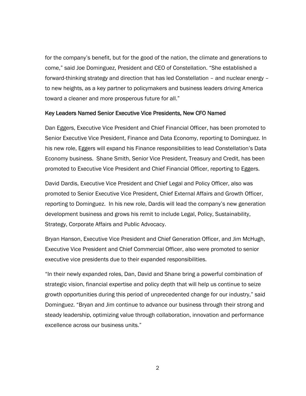 2 for the company’s benefit, but for the good of the nation, the climate and generations to come,” said Joe Dominguez, President and CEO of Constellation. “She established a forward-thinking strategy and direction that has led Constellation – and nuclear energy – to new heights, as a key partner to policymakers and business leaders driving America toward a cleaner and more prosperous future for all.” Key Leaders Named Senior Executive Vice Presidents, New CFO Named Dan Eggers, Executive Vice President and Chief Financial Officer, has been promoted to Senior Executive Vice President, Finance and Data Economy, reporting to Dominguez. In his new role, Eggers will expand his Finance responsibilities to lead Constellation’s Data Economy business. Shane Smith, Senior Vice President, Treasury and Credit, has been promoted to Executive Vice President and Chief Financial Officer, reporting to Eggers. David Dardis, Executive Vice President and Chief Legal and Policy Officer, also was promoted to Senior Executive Vice President, Chief External Affairs and Growth Officer, reporting to Dominguez. In his new role, Dardis will lead the company’s new generation development business and grows his remit to include Legal, Policy, Sustainability, Strategy, Corporate Affairs and Public Advocacy. Bryan Hanson, Executive Vice President and Chief Generation Officer, and Jim McHugh, Executive Vice President and Chief Commercial Officer, also were promoted to senior executive vice presidents due to their expanded responsibilities. “In their newly expanded roles, Dan, David and Shane bring a powerful combination of strategic vision, financial expertise and policy depth that will help us continue to seize growth opportunities during this period of unprecedented change for our industry,” said Dominguez. “Bryan and Jim continue to advance our business through their strong and steady leadership, optimizing value through collaboration, innovation and performance excellence across our business units.”