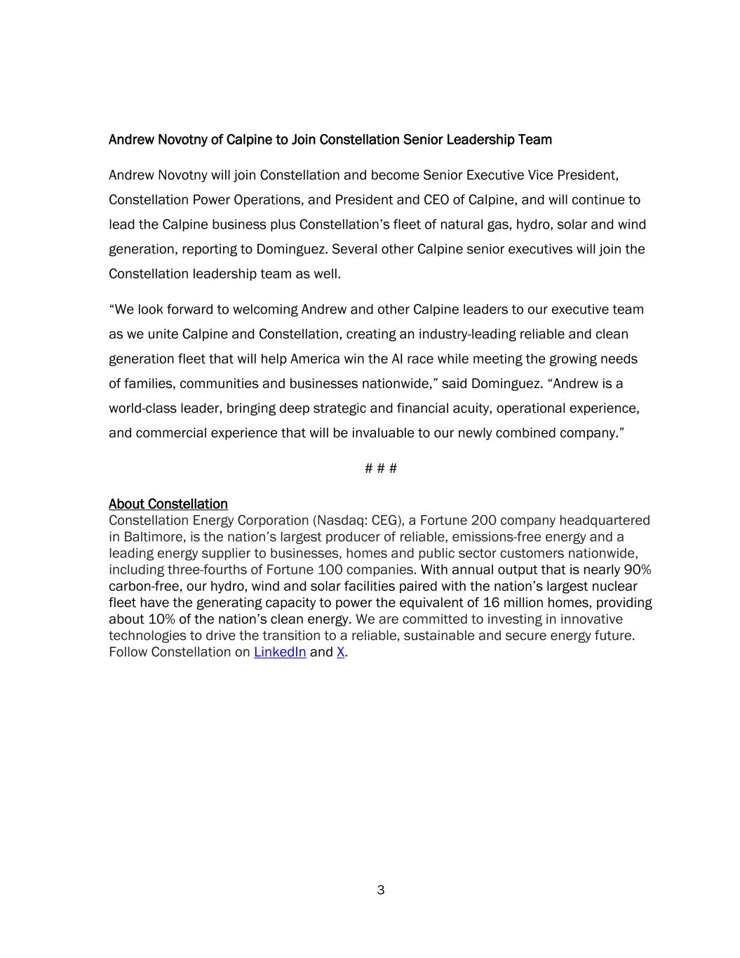 3 Andrew Novotny of Calpine to Join Constellation Senior Leadership Team Andrew Novotny will join Constellation and become Senior Executive Vice President, Constellation Power Operations, and President and CEO of Calpine, and will continue to lead the Calpine business plus Constellation’s fleet of natural gas, hydro, solar and wind generation, reporting to Dominguez. Several other Calpine senior executives will join the Constellation leadership team as well. “We look forward to welcoming Andrew and other Calpine leaders to our executive team as we unite Calpine and Constellation, creating an industry-leading reliable and clean generation fleet that will help America win the AI race while meeting the growing needs of families, communities and businesses nationwide,” said Dominguez. “Andrew is a world-class leader, bringing deep strategic and financial acuity, operational experience, and commercial experience that will be invaluable to our newly combined company.” # # # About Constellation Constellation Energy Corporation (Nasdaq: CEG), a Fortune 200 company headquartered in Baltimore, is the nation’s largest producer of reliable, emissions-free energy and a leading energy supplier to businesses, homes and public sector customers nationwide, including three-fourths of Fortune 100 companies. With annual output that is nearly 90% carbon-free, our hydro, wind and solar facilities paired with the nation’s largest nuclear fleet have the generating capacity to power the equivalent of 16 million homes, providing about 10% of the nation’s clean energy. We are committed to investing in innovative technologies to drive the transition to a reliable, sustainable and secure energy future. Follow Constellation on LinkedIn and X.