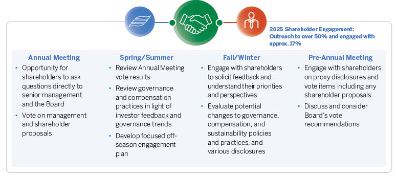 We also support Board effectiveness through director education opportunities, which help directors stay current on best practices and developments in corporate governance and on topics that present special risks and opportunities to the company. These opportunities are complemented by the company’s annual shareholder engagement program, which provides our Board with meaningful insights into investor perspectives and