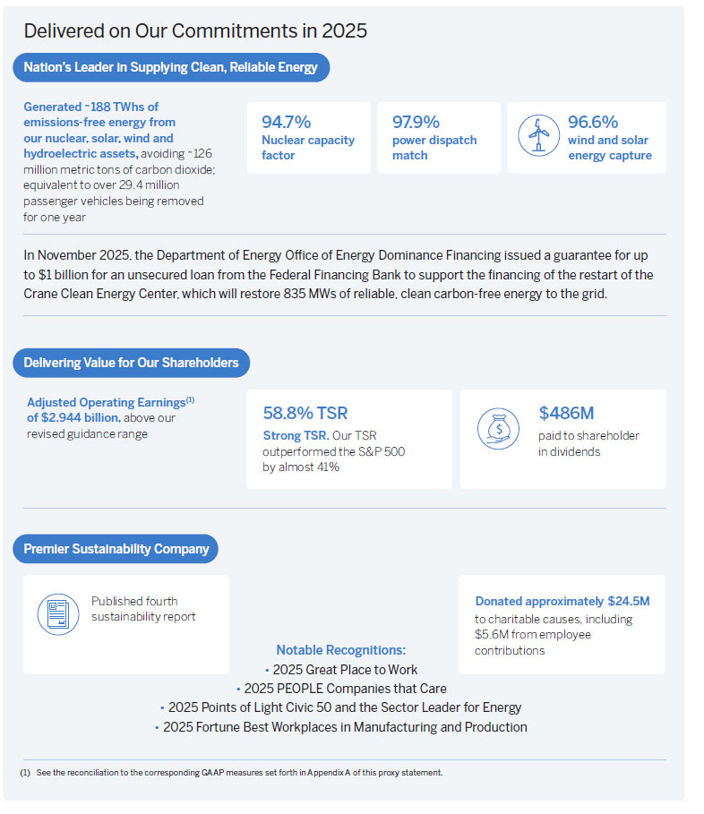 In January 2026, we completed our acquisition of Calpine Corporation, uniting Constellation’s zero-emission nuclear fleet with Calpine’s premier natural gas and geothermal fleets to create America’s largest clean and reliable energy producer. Uniting these fleets with a leading commercial platform further positions Constellation to deliver innovative customer solutions and strengthen America’s energy leadership, national security, and economic prosperity. Through this acquisition, Constellation can provide customers nationwide with access to the broadest array of clean and reliable energy solutions in the industry, while offering customers greater choice, competitive prices, and tailored clean energy products. The acquisition strengthens Constellation’s footprint in high-demand regions, including Texas and California, while maintaining significant operations in Illinois, Maryland, New York and Pennsylvania. The acquisition also brings together two exceptional teams with shared cultures of safety, operational excellence, and community partnership. The Board carefully oversaw the strategic review, diligence, and approval process and will continue to monitor integration progress to ensure the combined company delivers on its commitments.