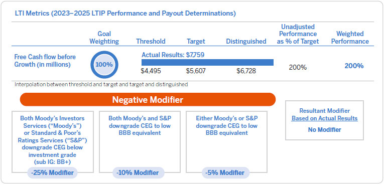 Free Cash Flow before Growth is adjusted cash flows from operations, which primarily includes net cash flows from operating activities and collection of deferred purchase price related to a revolving accounts receivable arrangement, less capital expenditures for maintenance and nuclear fuel, non-recurring capital expenditures related to separation and enterprise resource program implementation, changes in collateral, net merger and acquisitions, and equity investments and other items. For compensation purposes only, Free Cash Flow before Growth is adjusted to exclude impacts of changes in working capital.
