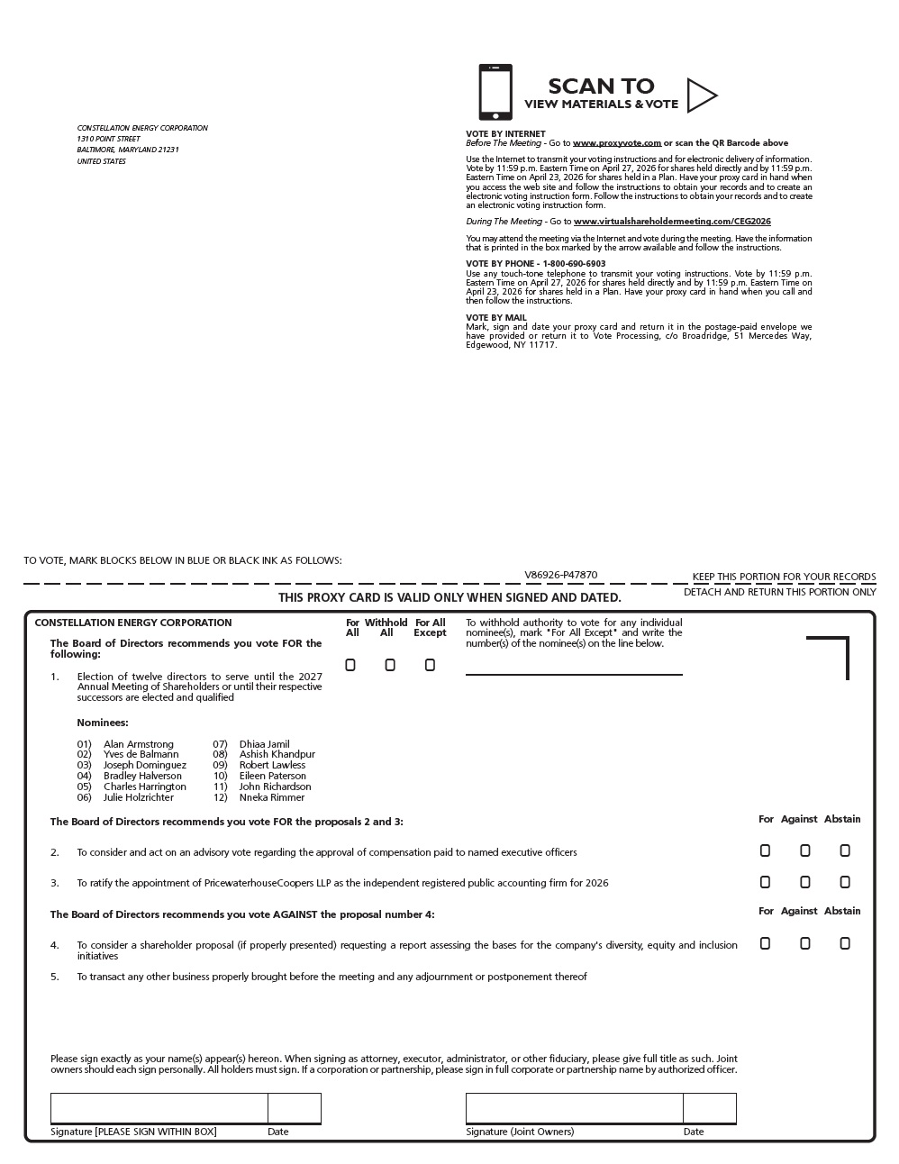 Signature [PLEASE SIGN WITHIN BOX] Date Signature (Joint Owners) Date TO VOTE, MARK BLOCKS BELOW IN BLUE OR BLACK INK AS FOLLOWS: KEEP THIS PORTION FOR YOUR RECORDS THIS PROXY CARD IS VALID ONLY WHEN SIGNED AND DATED. DETACH AND RETURN THIS PORTION ONLY V86926-P47870 ! ! ! 01) Alan Armstrong 02) Yves de Balmann 03) Joseph Dominguez 04) Bradley Halverson 05) Charles Harrington 06) Julie Holzrichter 07) Dhiaa Jamil 08) Ashish Khandpur 09) Robert Lawless 10) Eileen Paterson 11) John Richardson 12) Nneka Rimmer For All Withhold All For All Except For Against Abstain For Against Abstain ! ! ! ! ! ! ! ! ! To withhold authority to vote for any individual nominee(s), mark "For All Except" and write the number(s) of the nominee(s) on the line below. Nominees: 2. To consider and act on an advisory vote regarding the approval of compensation paid to named executive officers 1. Election of twelve directors to serve until the 2027 Annual Meeting of Shareholders or until their respective successors are elected and qualified The Board of Directors recommends you vote FOR the following: The Board of Directors recommends you vote FOR the proposals 2 and 3: 3. To ratify the appointment of PricewaterhouseCoopers LLP as the independent registered public accounting firm for 2026 Please sign exactly as your name(s) appear(s) hereon. When signing as attorney, executor, administrator, or other fiduciary, please give full title as such. Joint owners should each sign personally. All holders must sign. If a corporation or partnership, please sign in full corporate or partnership name by authorized officer. CONSTELLATION ENERGY CORPORATION 5. To transact any other business properly brought before the meeting and any adjournment or postponement thereof The Board of Directors recommends you vote AGAINST the proposal number 4: 4. To consider a shareholder proposal (if properly presented) requesting a report assessing the bases for the company’s diversity, equity and inclusion initiatives SCAN TO VIEW MATERIALS & VOTE w CONSTELLATION ENERGY CORPORATION 1310 POINT STREET BALTIMORE, MARYLAND 21231 UNITED STATES VOTE BY INTERNET Before The Meeting - Go to www.proxyvote.com or scan the QR Barcode above Use the Internet to transmit your voting instructions and for electronic delivery of information. Vote by 11:59 p.m. Eastern Time on April 27, 2026 for shares held directly and by 11:59 p.m. Eastern Time on April 23, 2026 for shares held in a Plan. Have your proxy card in hand when you access the web site and follow the instructions to obtain your records and to create an electronic voting instruction form. Follow the instructions to obtain your records and to create an electronic voting instruction form. During The Meeting - Go to www.virtualshareholdermeeting.com/CEG2026 You may attend the meeting via the Internet and vote during the meeting. Have the information that is printed in the box marked by the arrow available and follow the instructions. VOTE BY PHONE - 1-800-690-6903 Use any touch-tone telephone to transmit your voting instructions. Vote by 11:59 p.m. Eastern Time on April 27, 2026 for shares held directly and by 11:59 p.m. Eastern Time on April 23, 2026 for shares held in a Plan. Have your proxy card in hand when you call and then follow the instructions. VOTE BY MAIL Mark, sign and date your proxy card and return it in the postage-paid envelope we have provided or return it to Vote Processing, c/o Broadridge, 51 Mercedes Way, Edgewood, NY 11717.