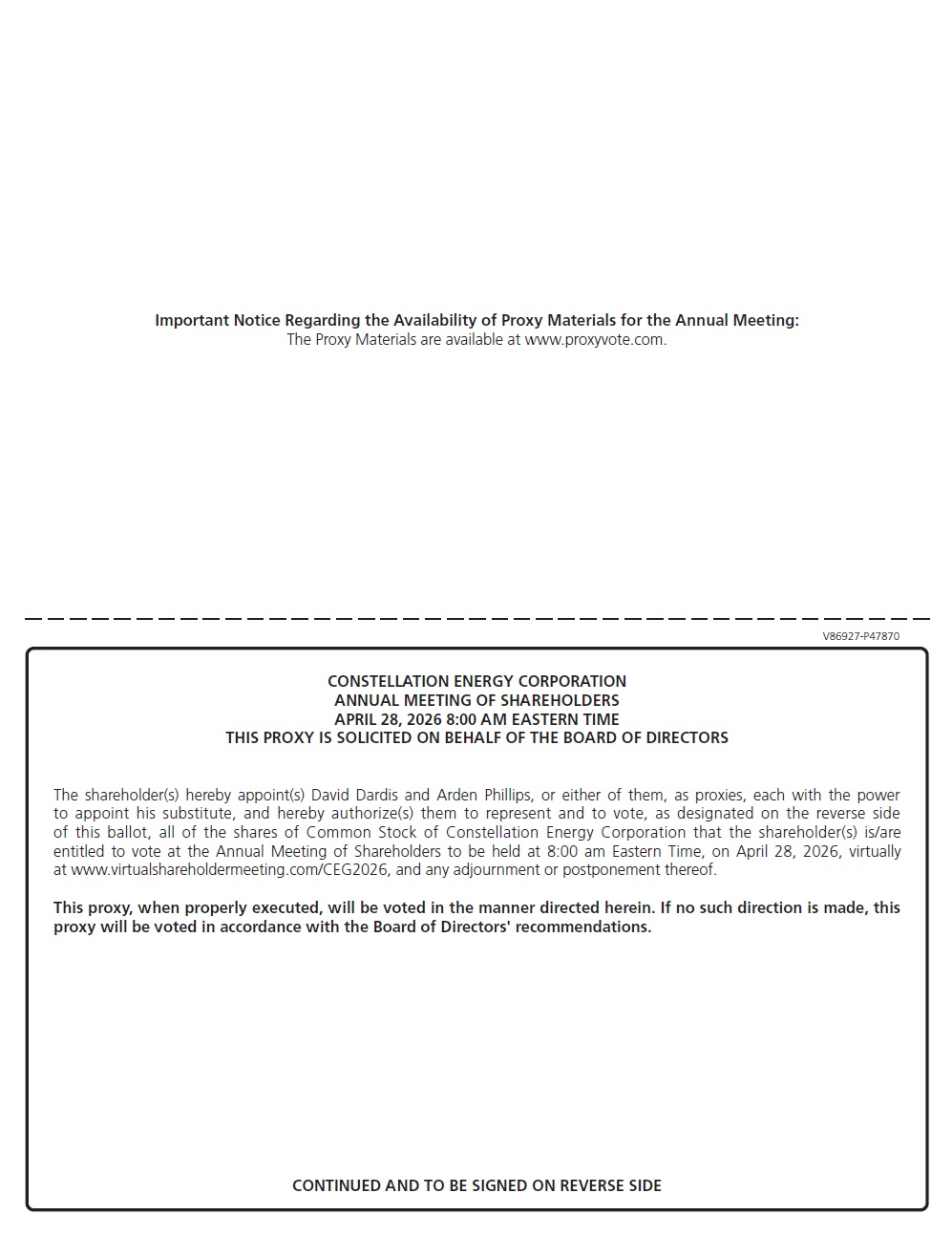 V86927-P47870 Important Notice Regarding the Availability of Proxy Materials for the Annual Meeting: The Proxy Materials are available at www.proxyvote.com. CONSTELLATION ENERGY CORPORATION ANNUAL MEETING OF SHAREHOLDERS APRIL 28, 2026 8:00 AM EASTERN TIME THIS PROXY IS SOLICITED ON BEHALF OF THE BOARD OF DIRECTORS The shareholder(s) hereby appoint(s) David Dardis and Arden Phillips, or either of them, as proxies, each with the power to appoint his substitute, and hereby authorize(s) them to represent and to vote, as designated on the reverse side of this ballot, all of the shares of Common Stock of Constellation Energy Corporation that the shareholder(s) is/are entitled to vote at the Annual Meeting of Shareholders to be held at 8:00 am Eastern Time, on April 28, 2026, virtually at www.virtualshareholdermeeting.com/CEG2026, and any adjournment or postponement thereof. This proxy, when properly executed, will be voted in the manner directed herein. If no such direction is made, this proxy will be voted in accordance with the Board of Directors’ recommendations. CONTINUED AND TO BE SIGNED ON REVERSE SIDE